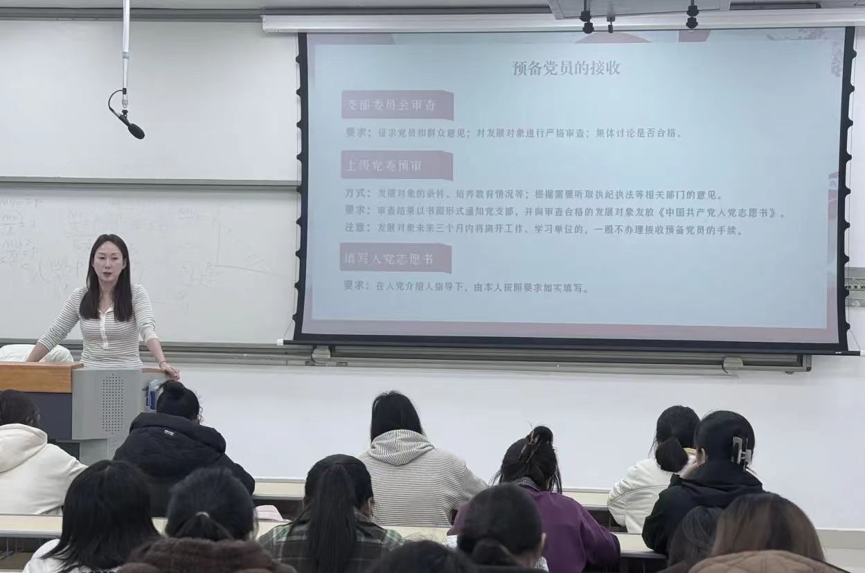 培训中,张岚岚以“发展党员工作流程”为主题,系统梳理了党员发展的关键环节,重点围绕“申请入党”、“入党积极分子”、“发展对象的确定与考察”以及“预备党员的接收”四个阶段进行了深入讲解,明确了各项流程的标准与要求。结合《中国共产党发展党员工作细则》,她首先阐述了申请入党的基本条件与程序。在明确入党申请的基本要求后,她指出,入党积极分子和发展对象的确定与考察是党员发展过程中的重要环节。她希望同学们在该环节自觉学习党的理论知识、坚定政治立场、努力学习,积极接受党组织的培养和考验。最后,她提醒同学们要加深对“预备党员的接收”环节三个关键步骤的认识,端正入党动机,构建清晰的知识体系。